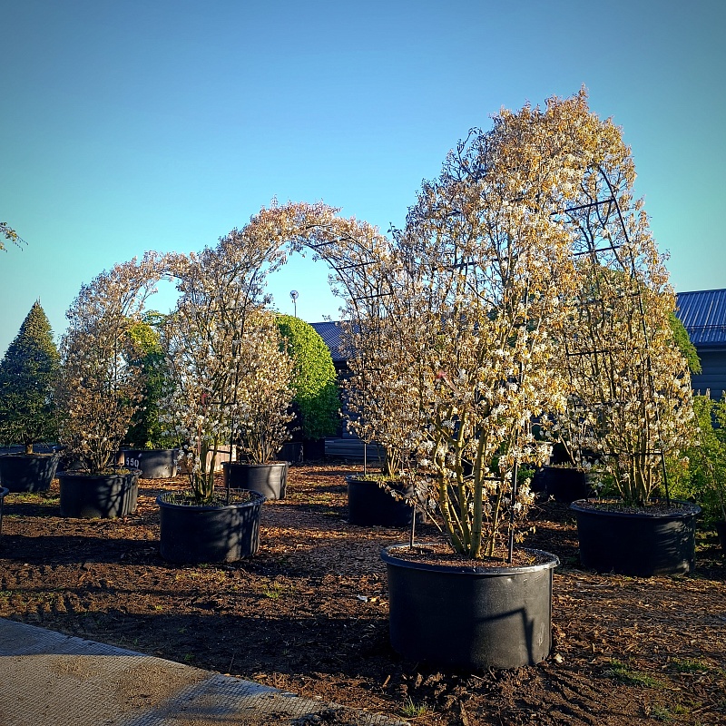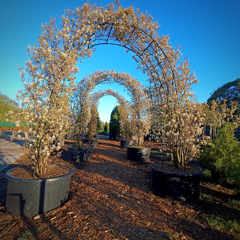 Форма арка делает растение идеальным элементом для оформления входных зон, дорожек, переходов между зонами, создавая ощущение завершённости и уюта. Благодаря изящным изгибам и тонкой структуре ветвей, арка из ирги легко вписывается в современные и природные стили ландшафта.