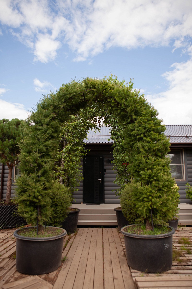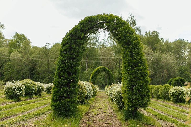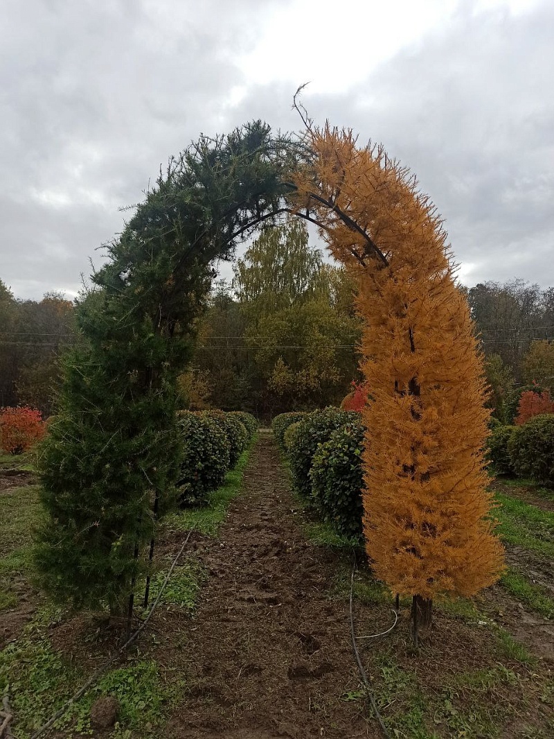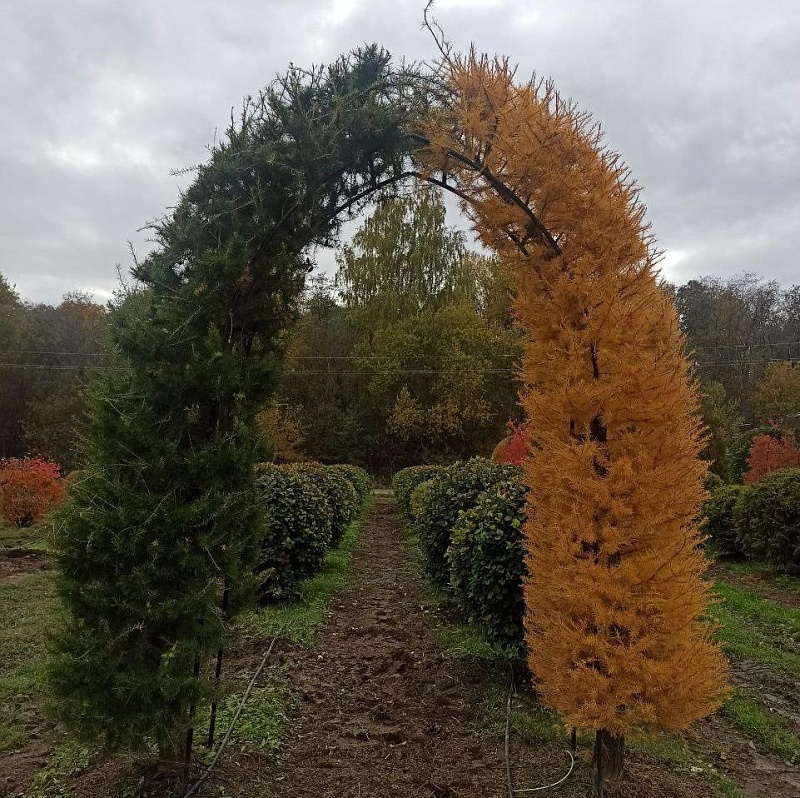Лиственница Маргилинда, сформированная в арку — это красивый и элегантный элемент ландшафта. Нежная зелень хвои весной, густая крона летом и солнечно-желтая окраска осенью позволят вам использовать этот декоративный элемент круглый год.