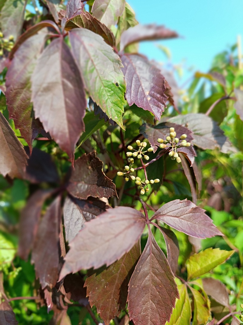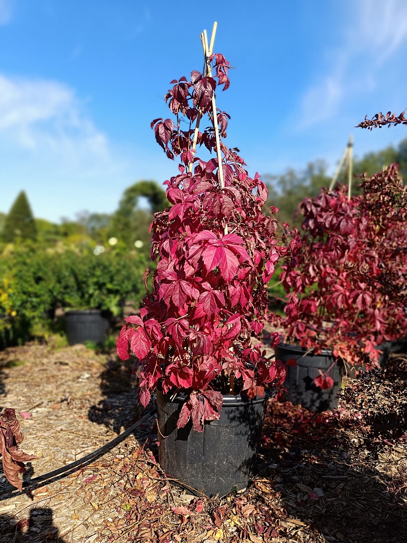 Девичий виноград — идеальное решение для вертикального озеленения: стремительно растущий, неприхотливый и невероятно декоративный в течение всего сезона. Весной и летом он покрывает опоры, стены, перголы и заборы плотной зелёной массой, а осенью вспыхивает всей палитрой багряных и пурпурных оттенков.